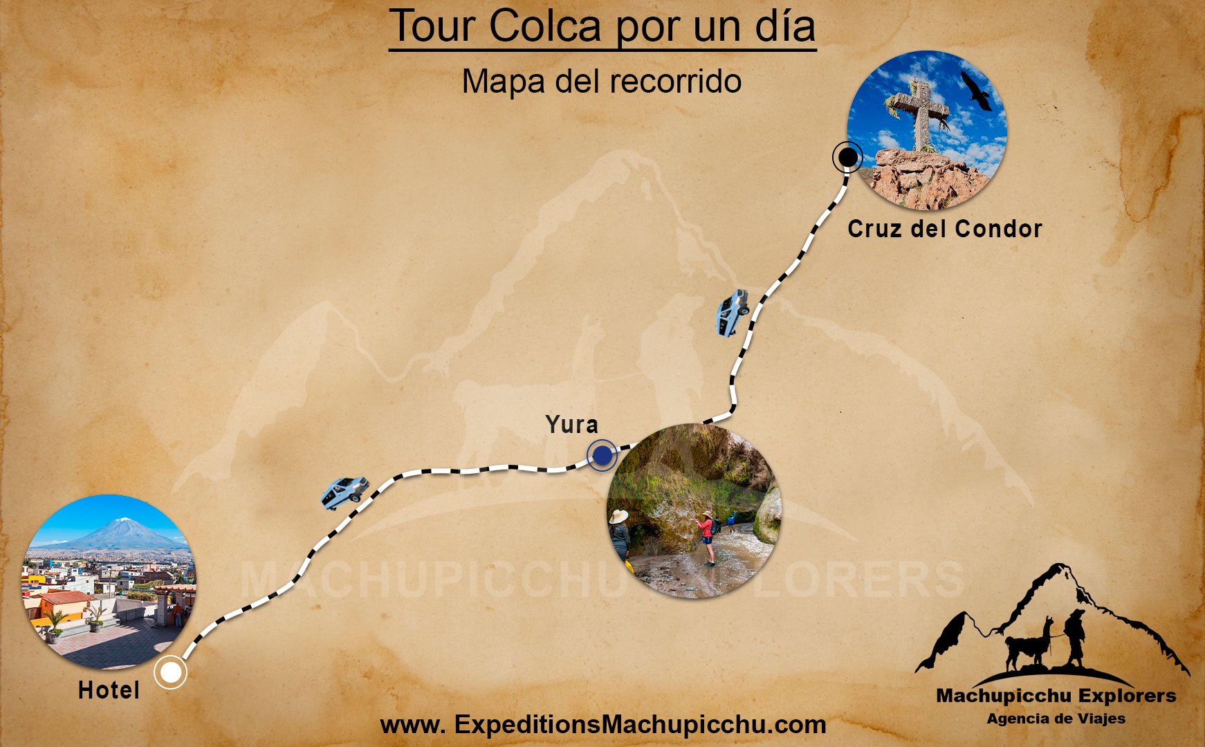 02:30 a 03:00 a.m. recojo de los pasajeros de los diferentes hoteles, para iniciar el viaje por Yura, el viaje se hará directo hacia la cruz del cóndor (aprox. 5 horas), deteniéndonos en el pueblo de Chivay, únicamente para desayunar. 08:30 aproximadamente arribaremos a la Cruz del cóndor en el valle del colca desde donde podremos apreciar uno de los cañones más profundos del mundo y donde se encuentra el santuario del cóndor. De regreso nos detendremos en los pueblos de Pinchollo, Maca y Yanque que cuentan con bellas iglesias coloniales; así como en los miradores de Antahuilque, Huayrapunko y Peña Blanca, desde donde podremos apreciar el bello paisaje del colca con su impresionante andenería. 11:30 aprox. Ya en Chivay nos dirigiremos a los baños termales. 12:30 aprox. Almuerzo en Chivay y retorno a Arequipa 13:30 De regreso nos detendremos en el mirador de los volcanes (punto más alto 4,910msnm), en los bofedales de tocra donde se aprecia diversidad de aves silvestres, manadas de alpacas y llamas; en pampa Cañahuas observaremos tropillas de vicuñas (parte de la Reserva Nacional de Aguada Blanca y Salinas) el bello camélido sudamericano poseedor de una las fibras más finas del mundo 17:00 aprox. Arribo a Arequipa.